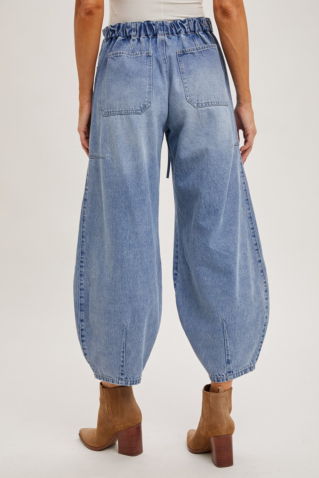 Denim mid-waist drawstring barrel jeans offer a relaxed yet stylish look. Featuring a mid-rise waist with an adjustable drawstring, these jeans provide a comfortable fit that blends casual ease with modern flair. The barrel-leg silhouette adds a contemporary touch, giving a slightly voluminous shape that tapers at the ankles.
