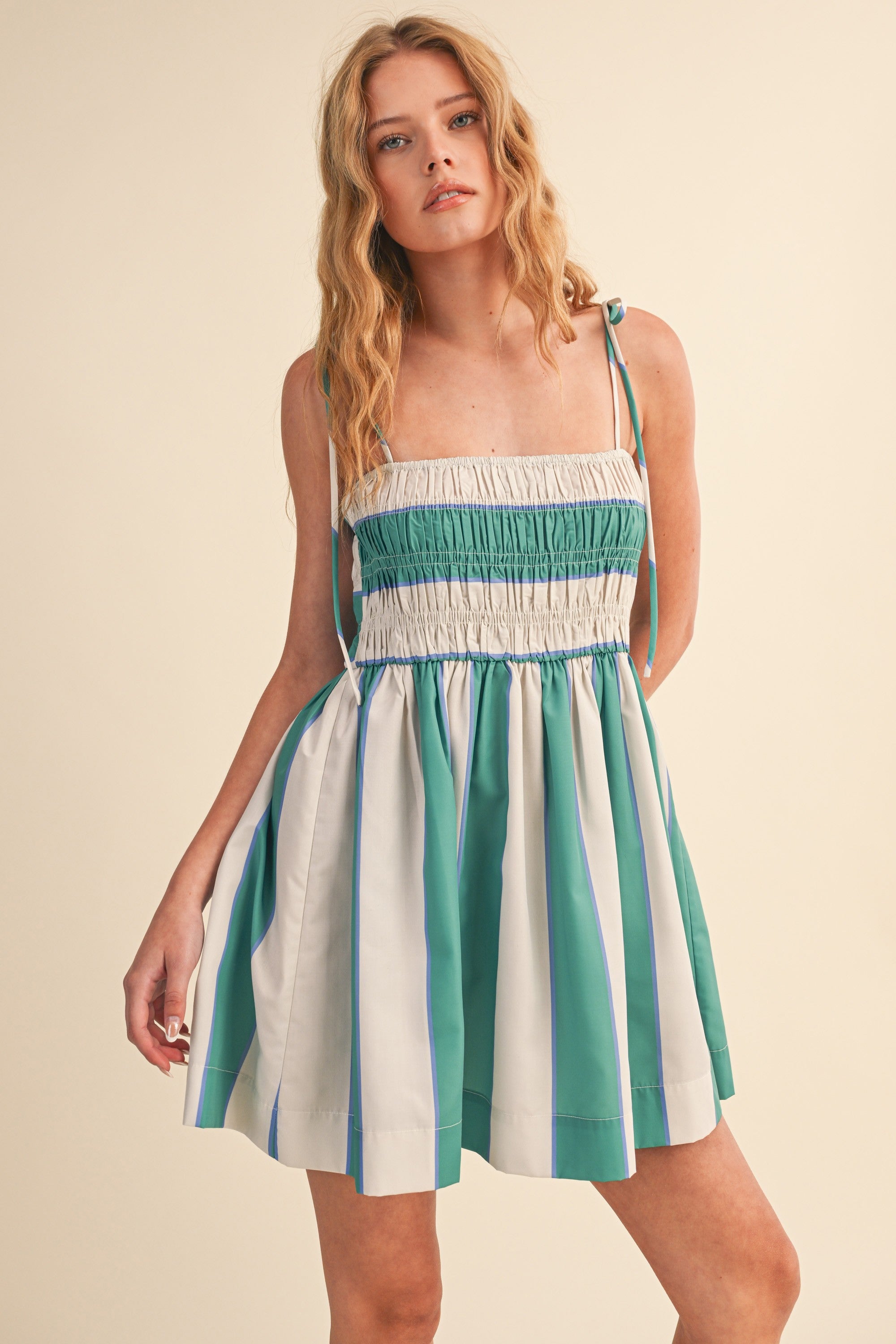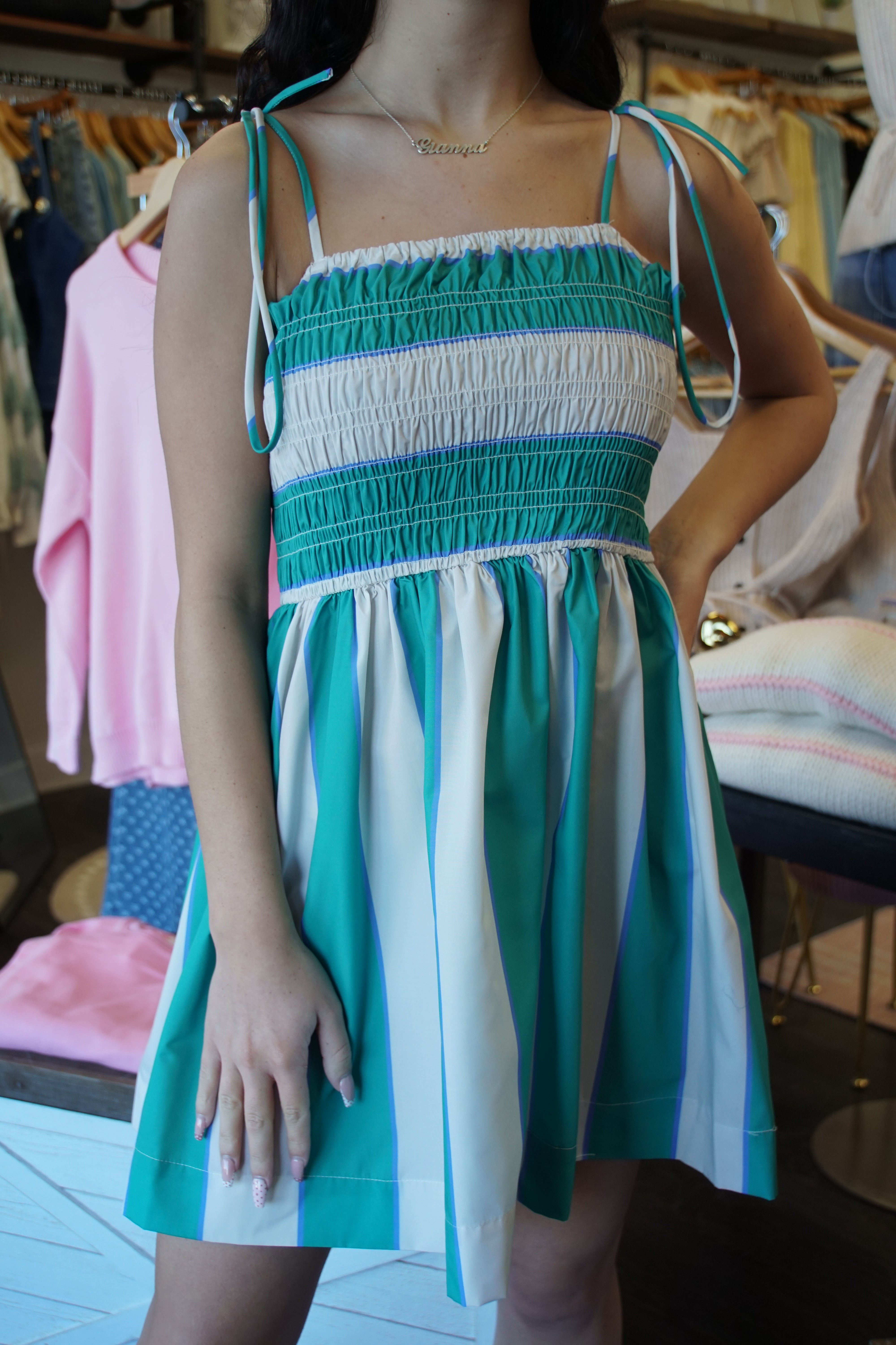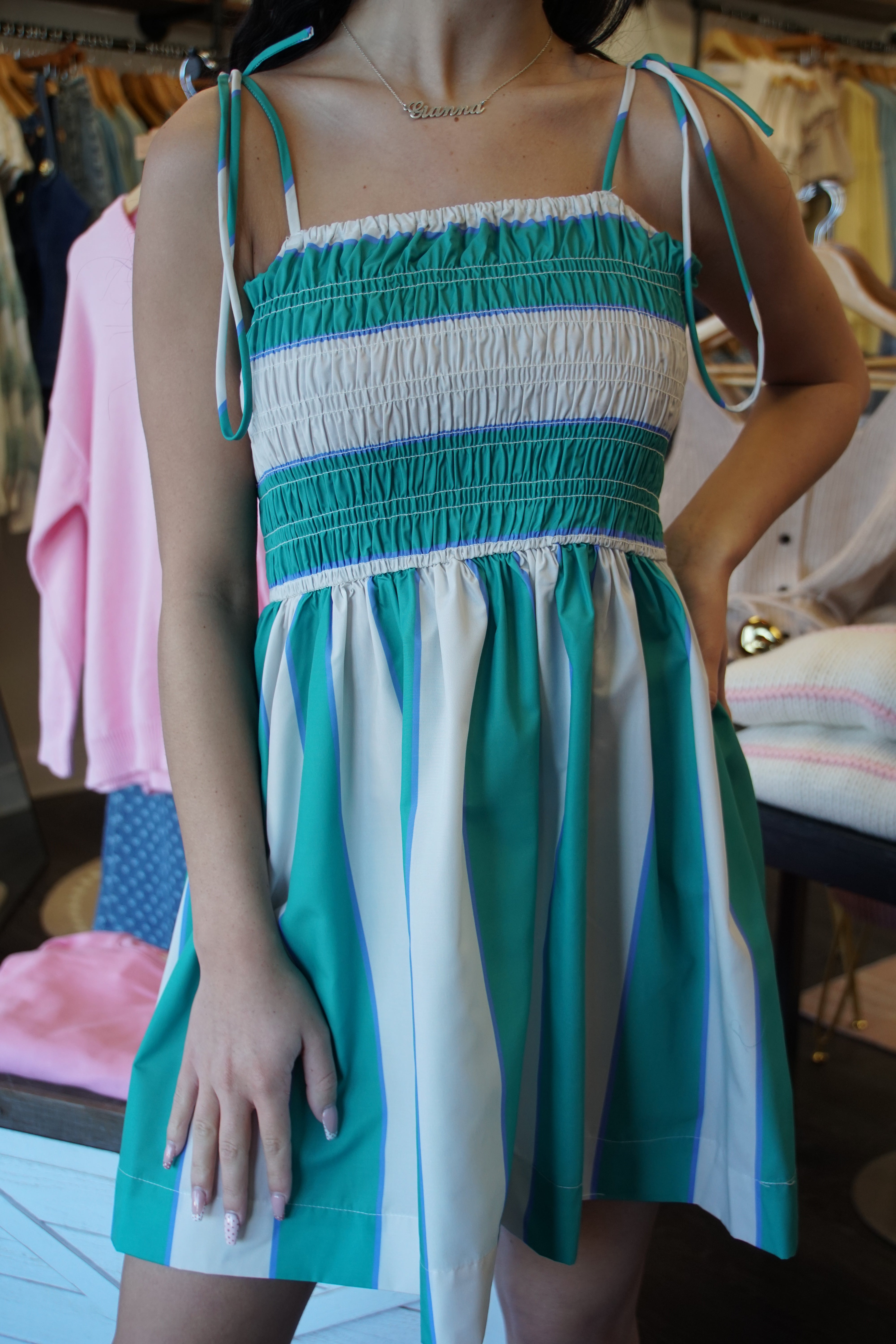 Easy, breezy, and effortlessly pretty—the Sweetgrass Smocked Dress is made for sunny days, slow mornings, and plans that turn into all-day outings. The green striped print feels fresh and timeless, while the smocked bodice gives you that comfy-but-flattering fit we all love.