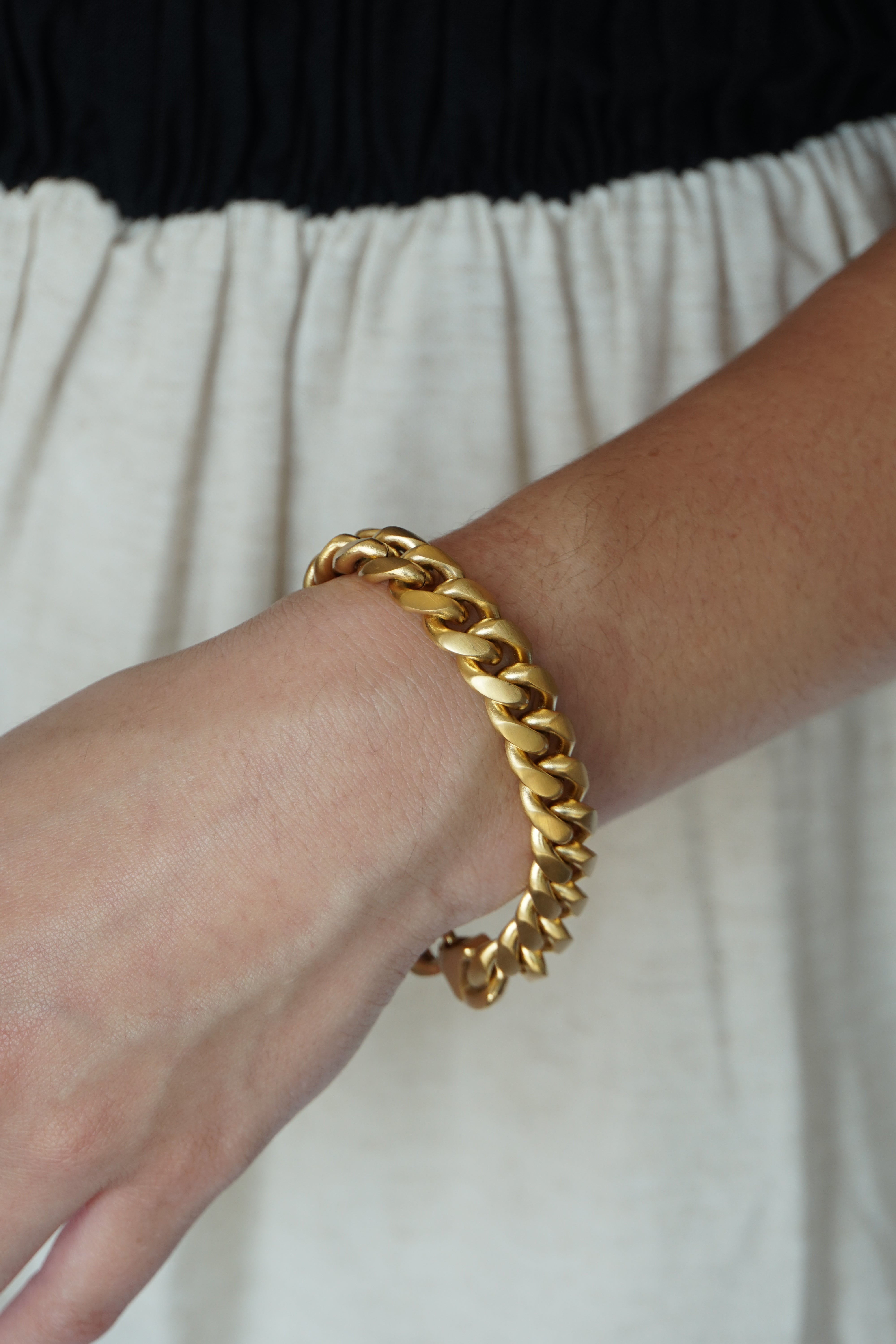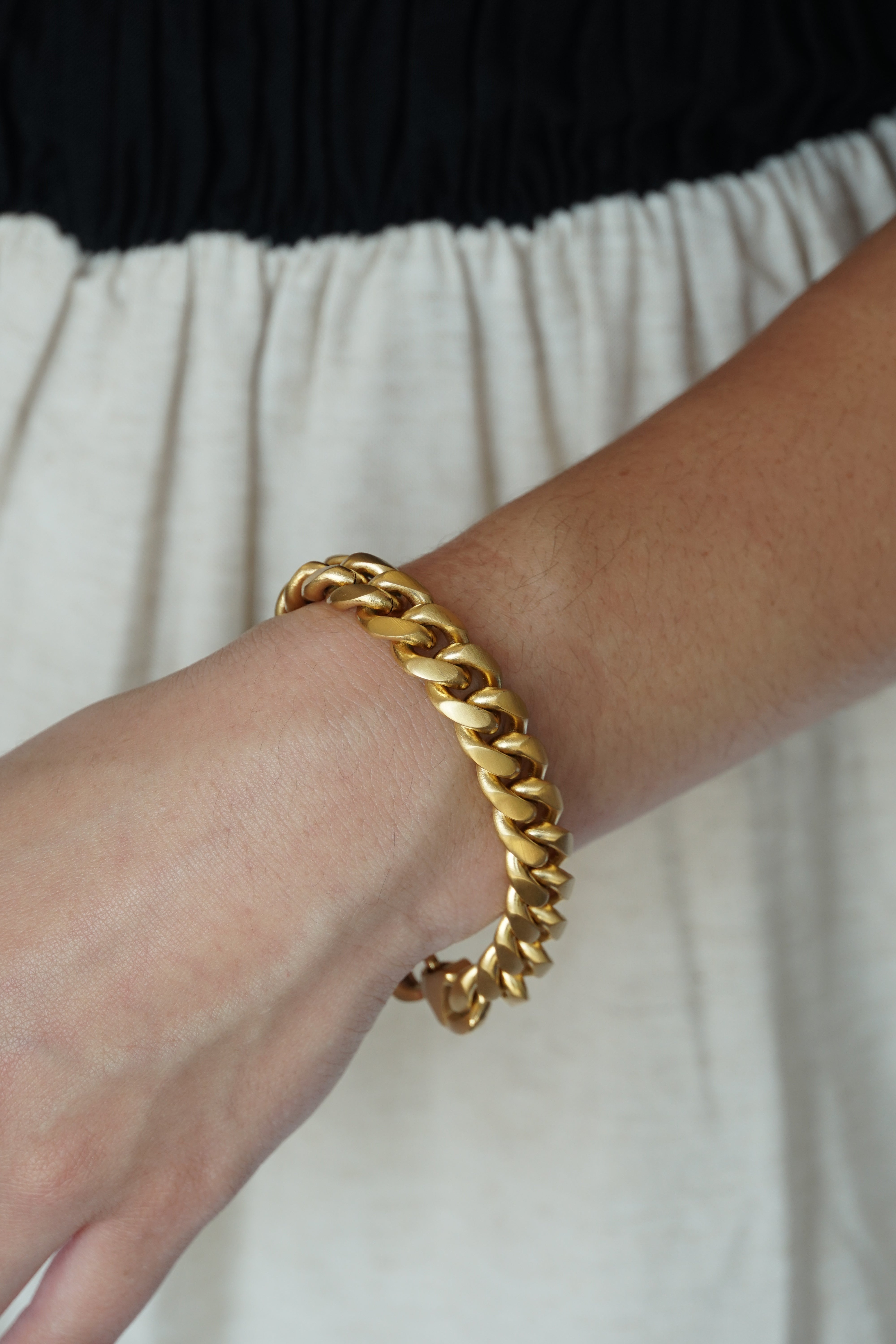 Elevate your style with our Chunky Link Gold Bracelet, a bold and luxurious statement piece that exudes sophistication and elegance. Crafted with meticulous attention to detail, this bracelet features a chunky link design that is sure to capture attention and make you stand out from the crowd. The luxurious gold material adds a touch of opulence to any outfit, whether you're dressing up for a special occasion or adding a glamorous twist to your everyday look. Embrace the allure of this stunning accessory and make a fashion statement like never before. Treat yourself to the Chunky Link Gold Bracelet and effortlessly elevate your ensemble with a touch of luxury and style!