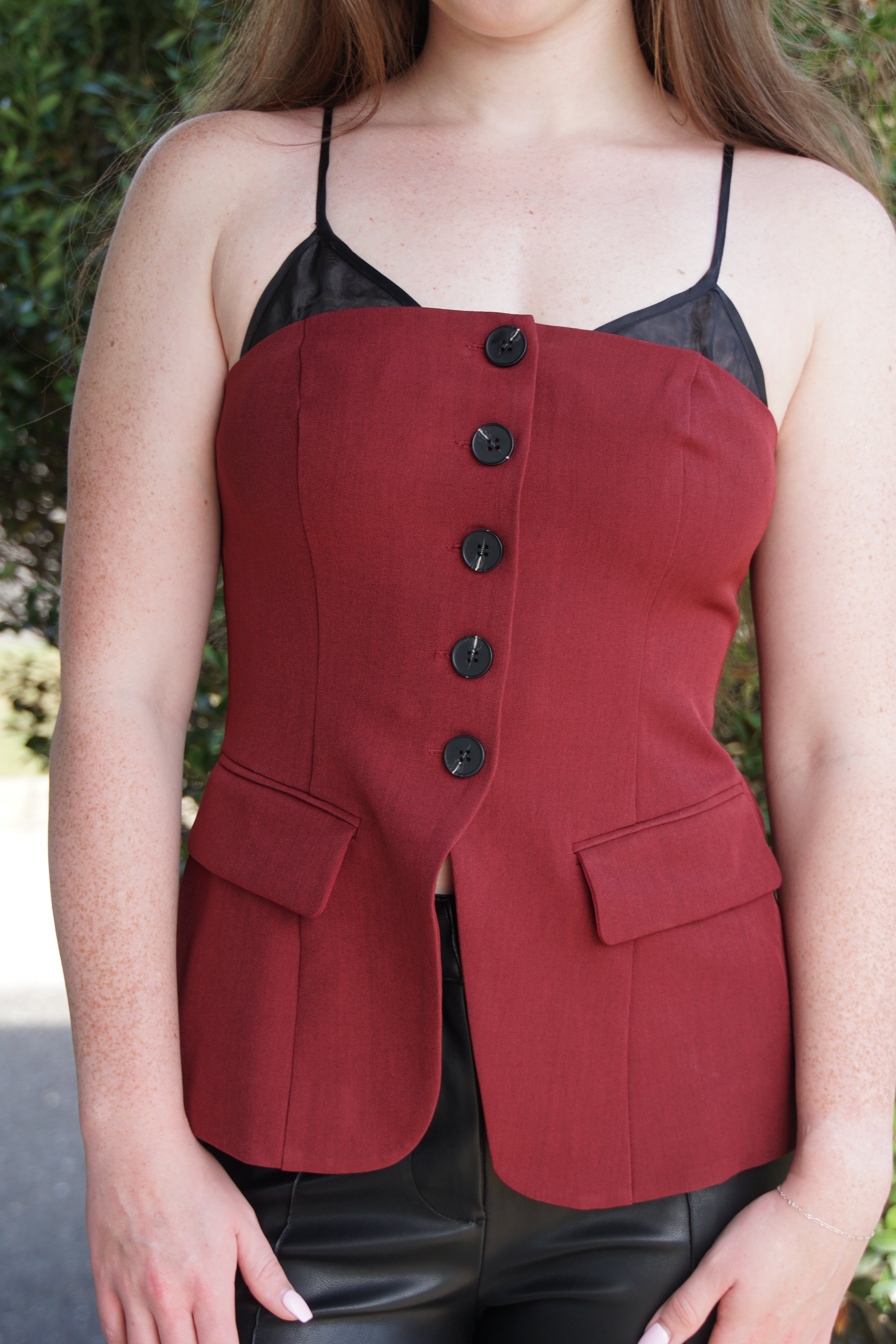 Elevate your style with the Burgundy Boss Babe Tank—a playful blend of contrast and softness. This button-down vest top offers a chic woven texture with just the right edge, perfect for making a confident statement while staying cozy. Whether layered or solo, it’s your go-to for boss vibes with a touch of fun.