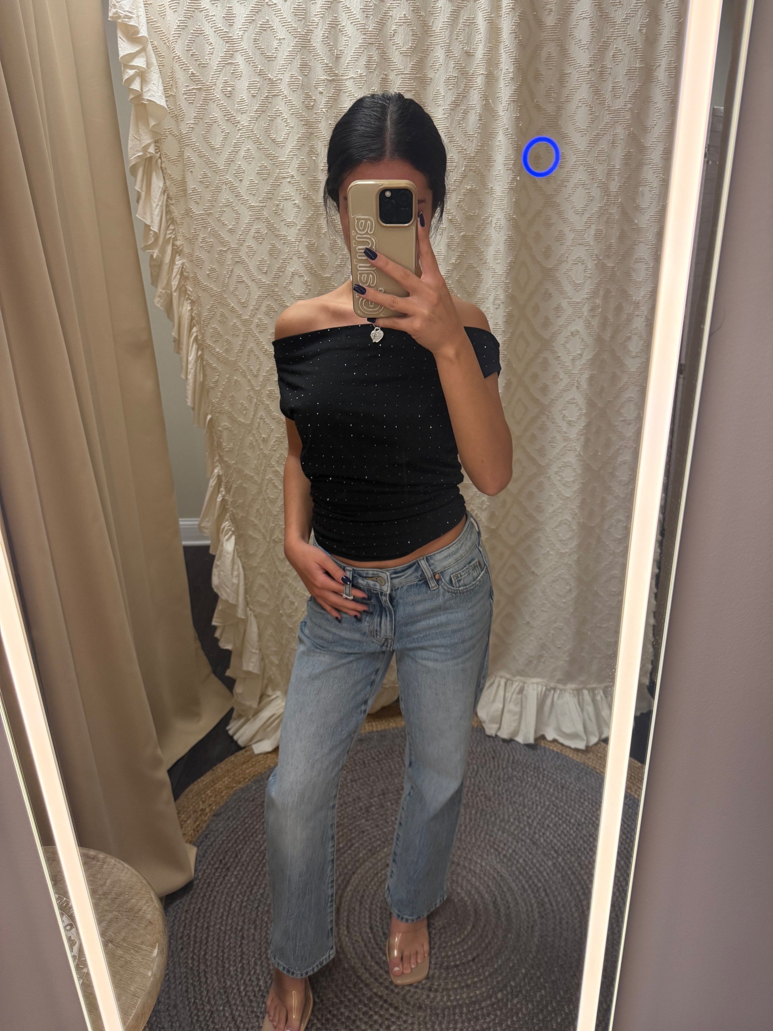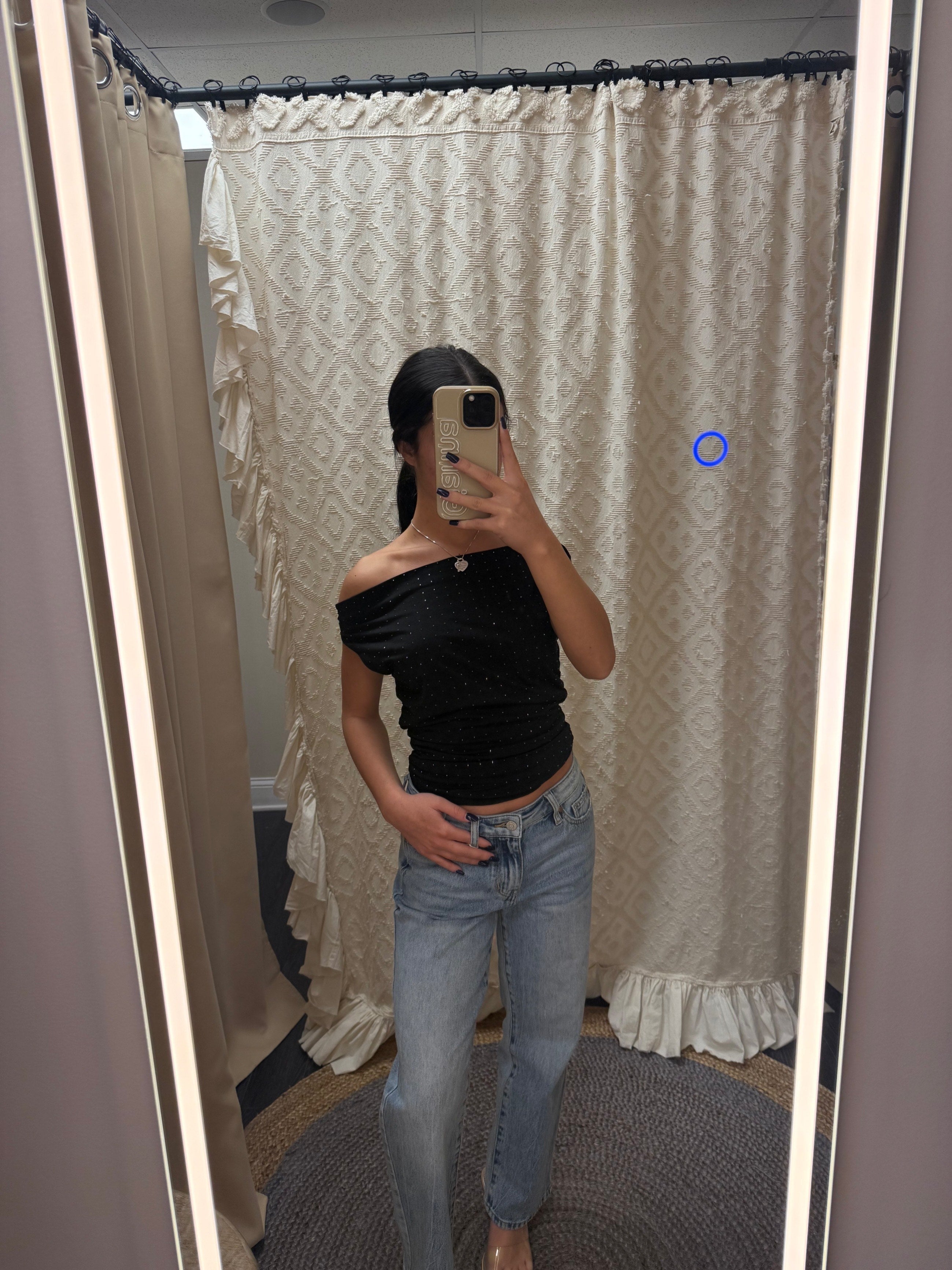 Bare your shoulders and let the sparkle do the talking! This chic black off-the-shoulder top features dazzling rhinestone embellishments that catch the light with every move. Perfect for date night, girls' night out, or whenever you want to add a touch of glamorous shimmer to your look. The relaxed off-shoulder neckline keeps things flirty and fun while the rhinestone details elevate your style quotient.