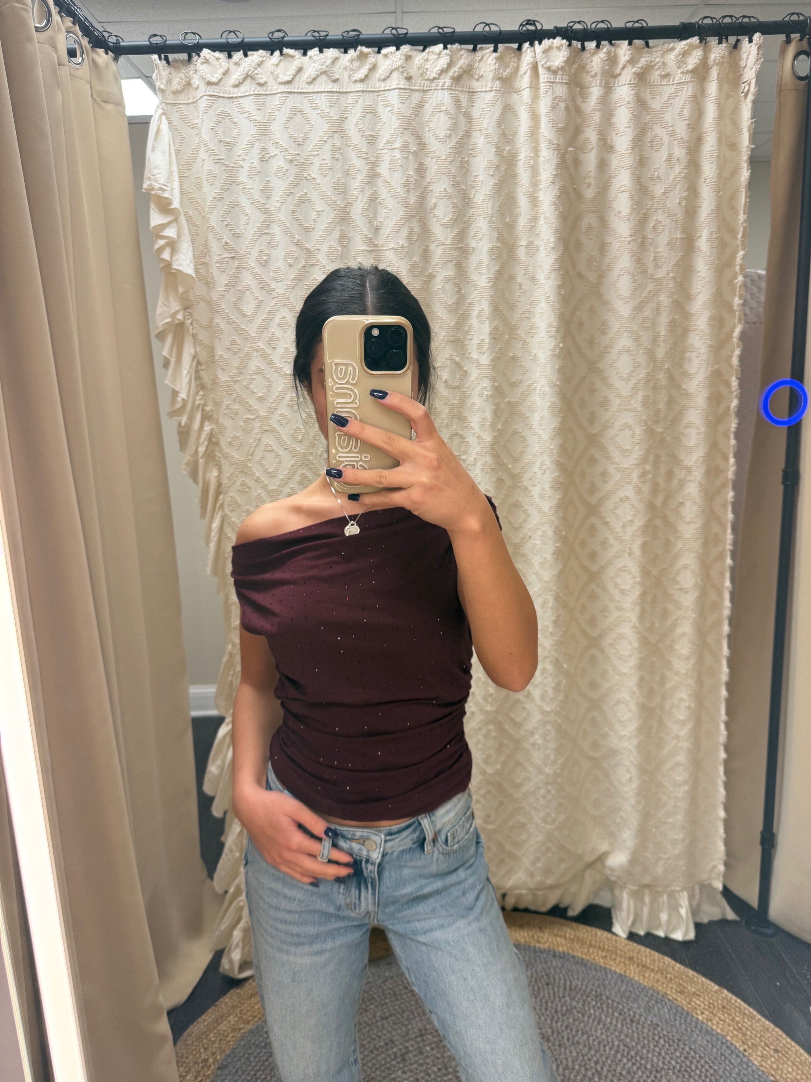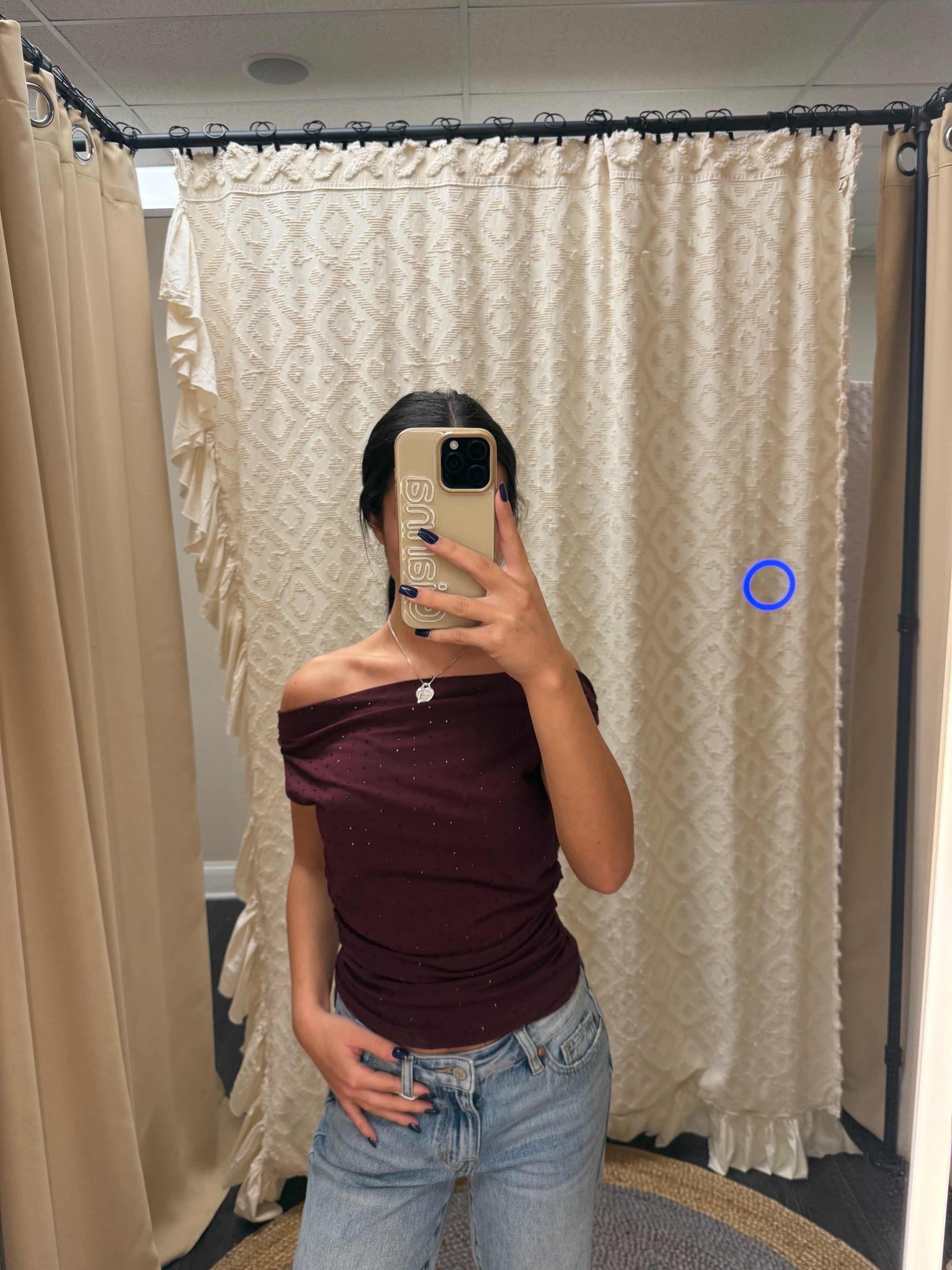 Bare your shoulders and let the sparkle do the talking! This off-the-shoulder top features dazzling rhinestones that catch the light with every move, perfect for date nights or nights out with the girls. The cherry hue adds a flirty pop of color while the draped neckline keeps things effortlessly chic. Dress it up with heels or down with sneakers—this versatile piece is your new go-to for turning heads.