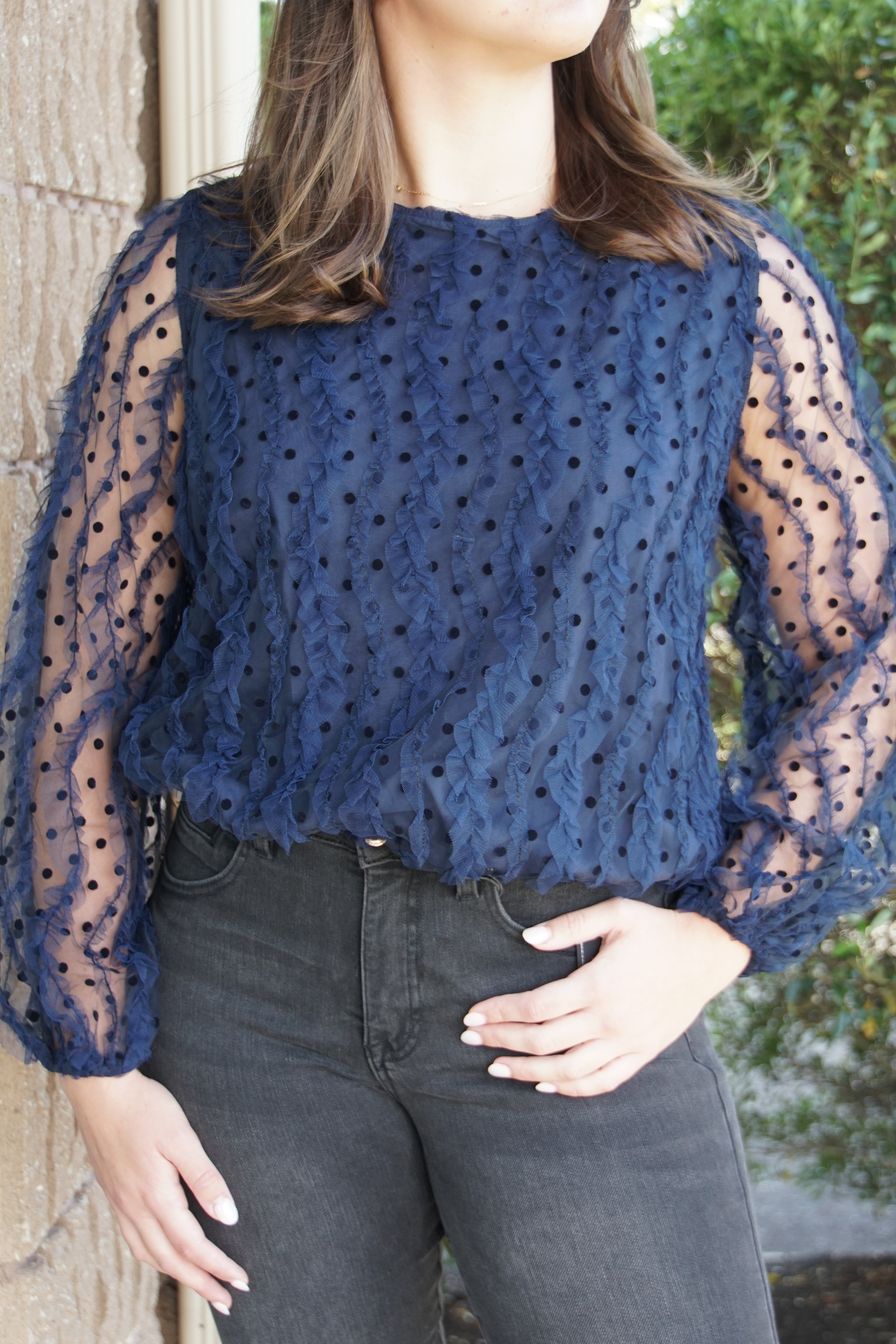 Add a fun twist to your wardrobe with this Textured Dot Top in navy. Featuring a classic round neck and full-length silhouette, it pairs effortlessly with your favorite bottoms. The sheer mesh sleeves dotted with subtle texture add a playful peek-a-boo effect, making it perfect for both day and night looks. Comfortable and stylish, this blouse brings a lively edge to any outfit.