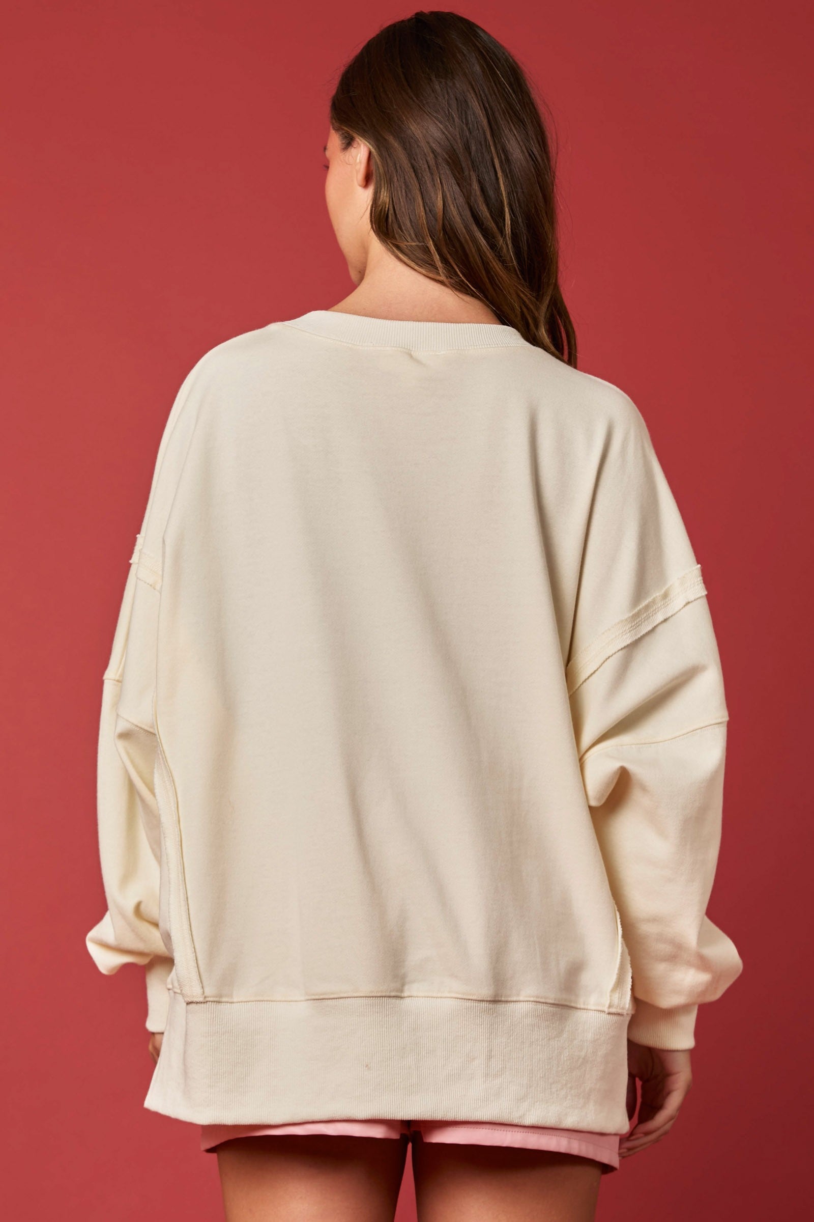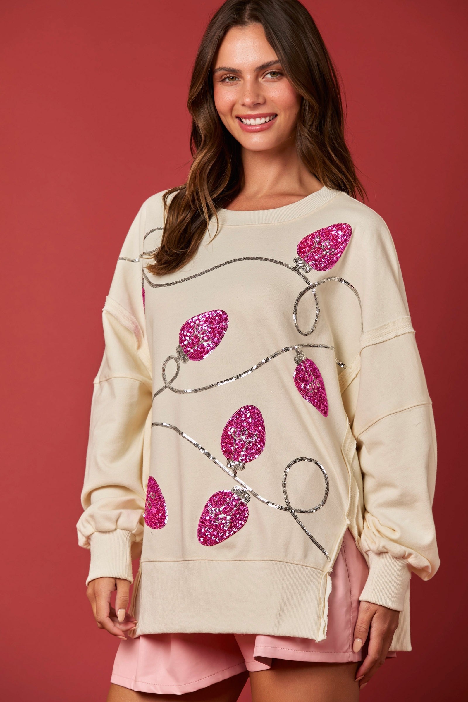 Wrap yourself in holiday sparkle with the Tinsel Glow Sweatshirt! This oversized gem features eye-catching sequin and embroidered Christmas ornament details that catch the light with every move. Perfect for festive gatherings, cozy nights in, or spreading seasonal cheer wherever you go. The relaxed fit ensures all-day comfort while the shimmering embellishments add that extra touch of magic. Make a merry statement this holiday season!