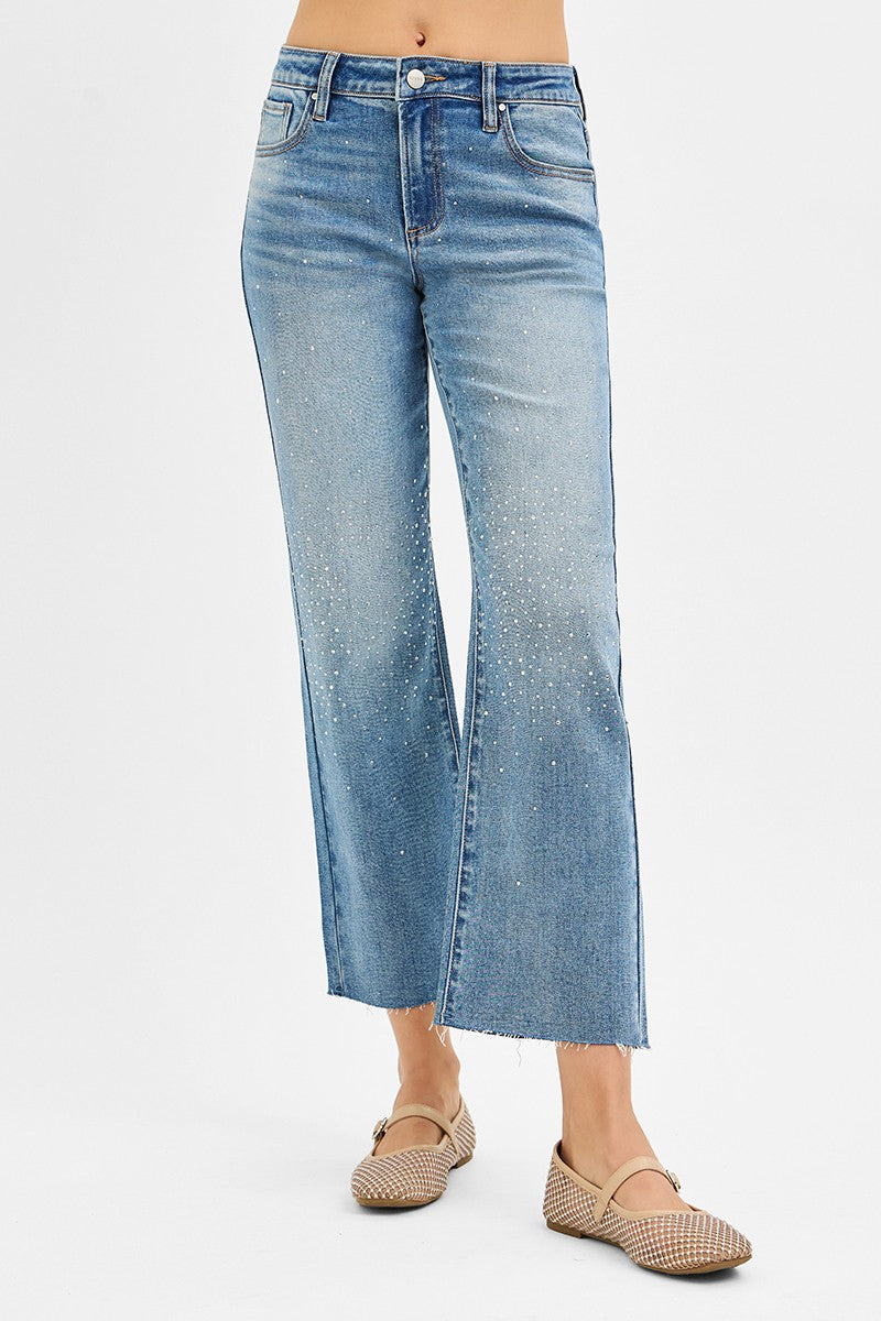 Step out in style with the Celeste High Rise Rhinestone Jean. These cropped, straight-leg jeans combine a flattering high-rise fit with sparkling rhinestone detailing for a touch of glam. Perfect for turning everyday looks into eye-catching outfits, they add just the right amount of dazzle while keeping comfort front and center. Elevate your denim game and let your personality shine through with every step.