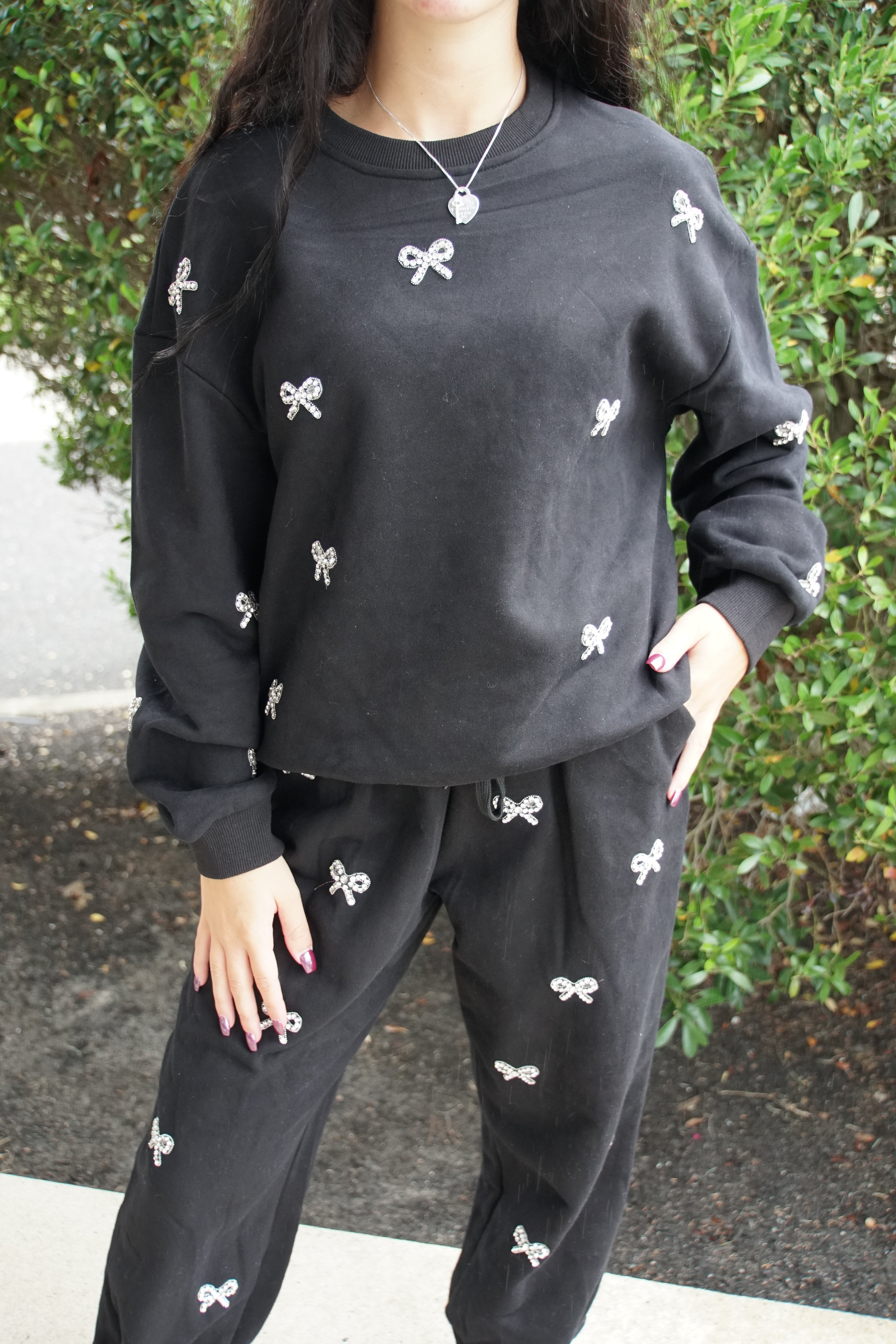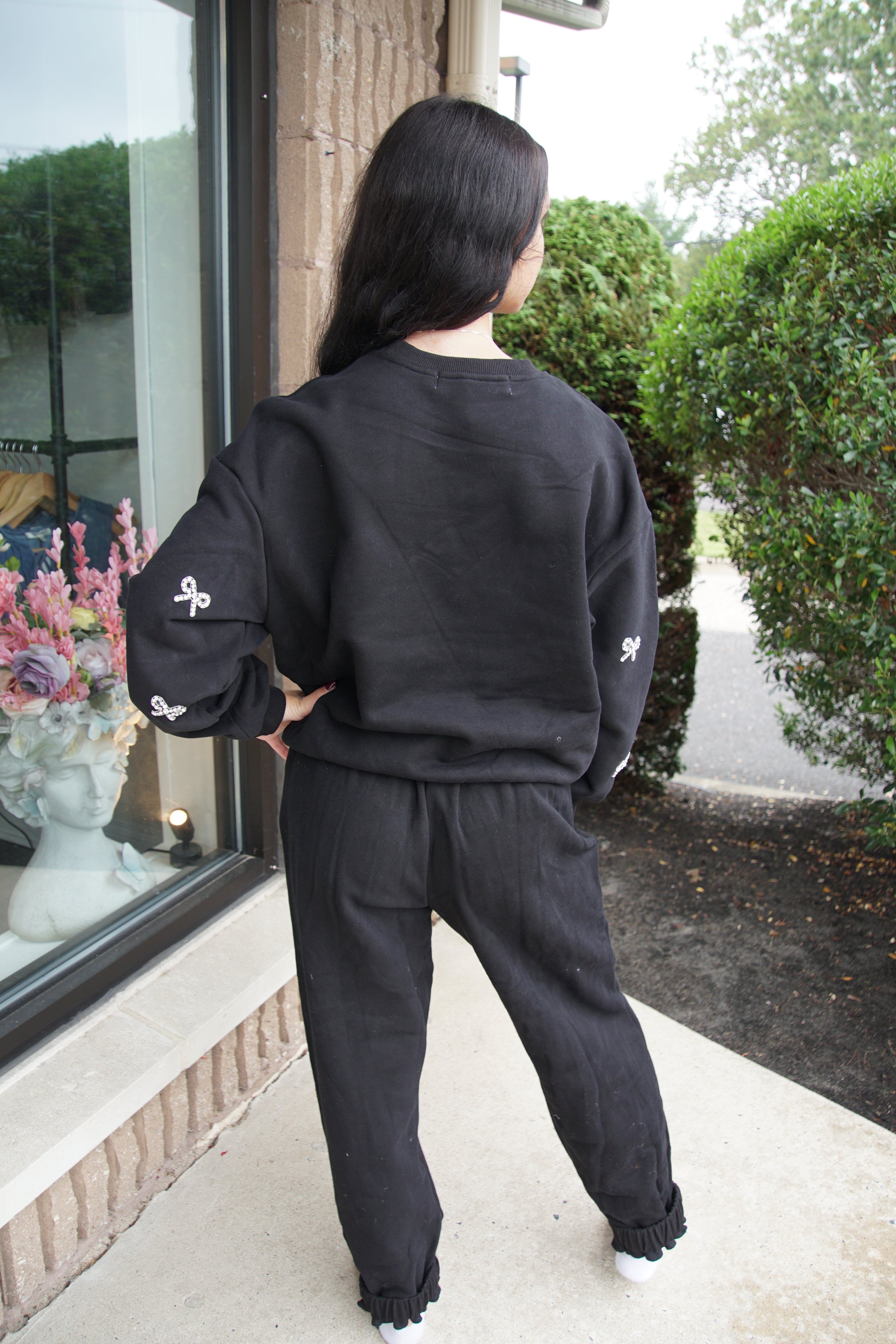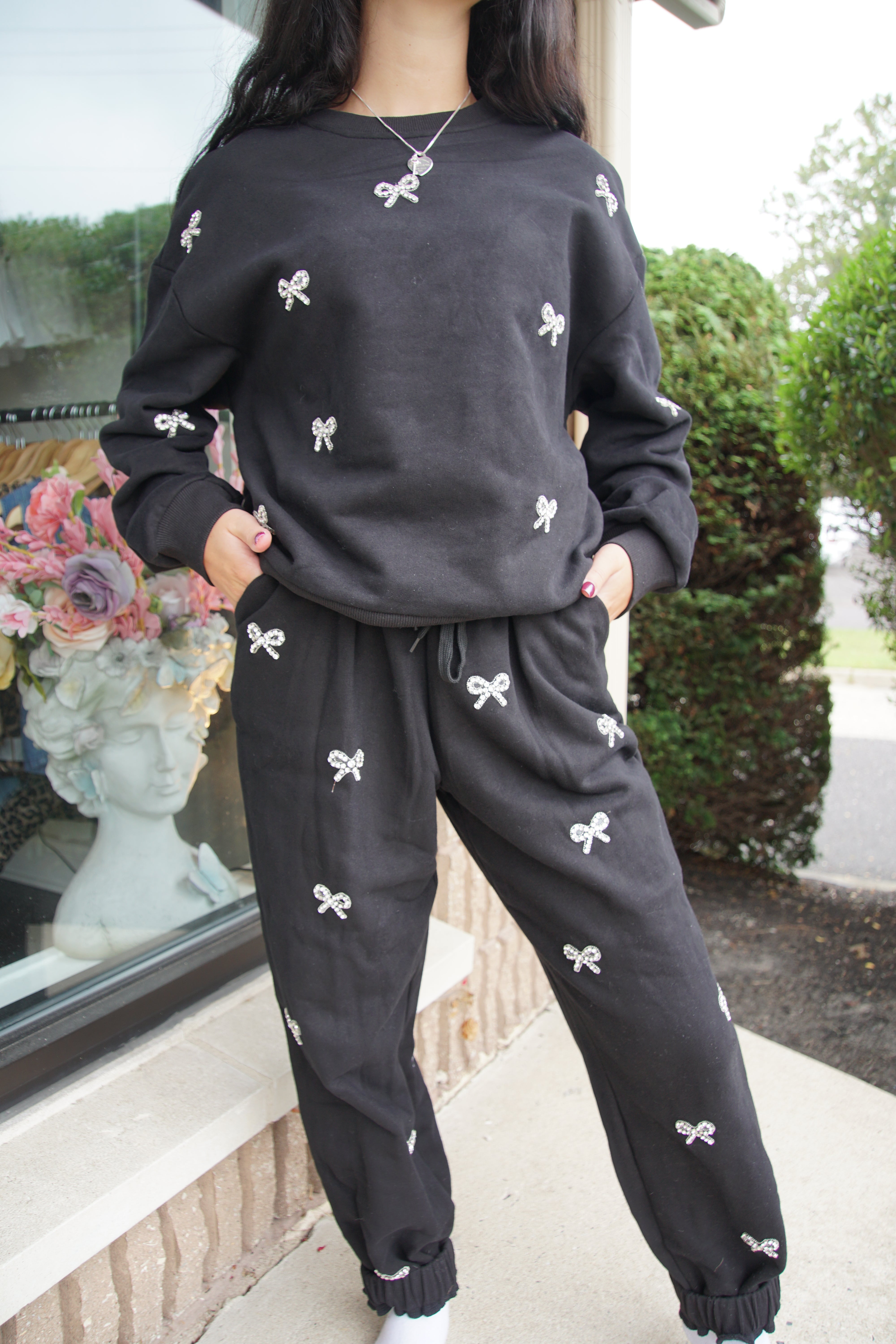 Get ready to shine in the Dazzle Me Bow Set, featuring sparkling rhinestone embellishments that catch the light with every move. This playful matching set includes comfy jogger pants and an oversized crewneck, perfect for lounging in style or stepping out with flair. Cozy meets glam in one fun package!
