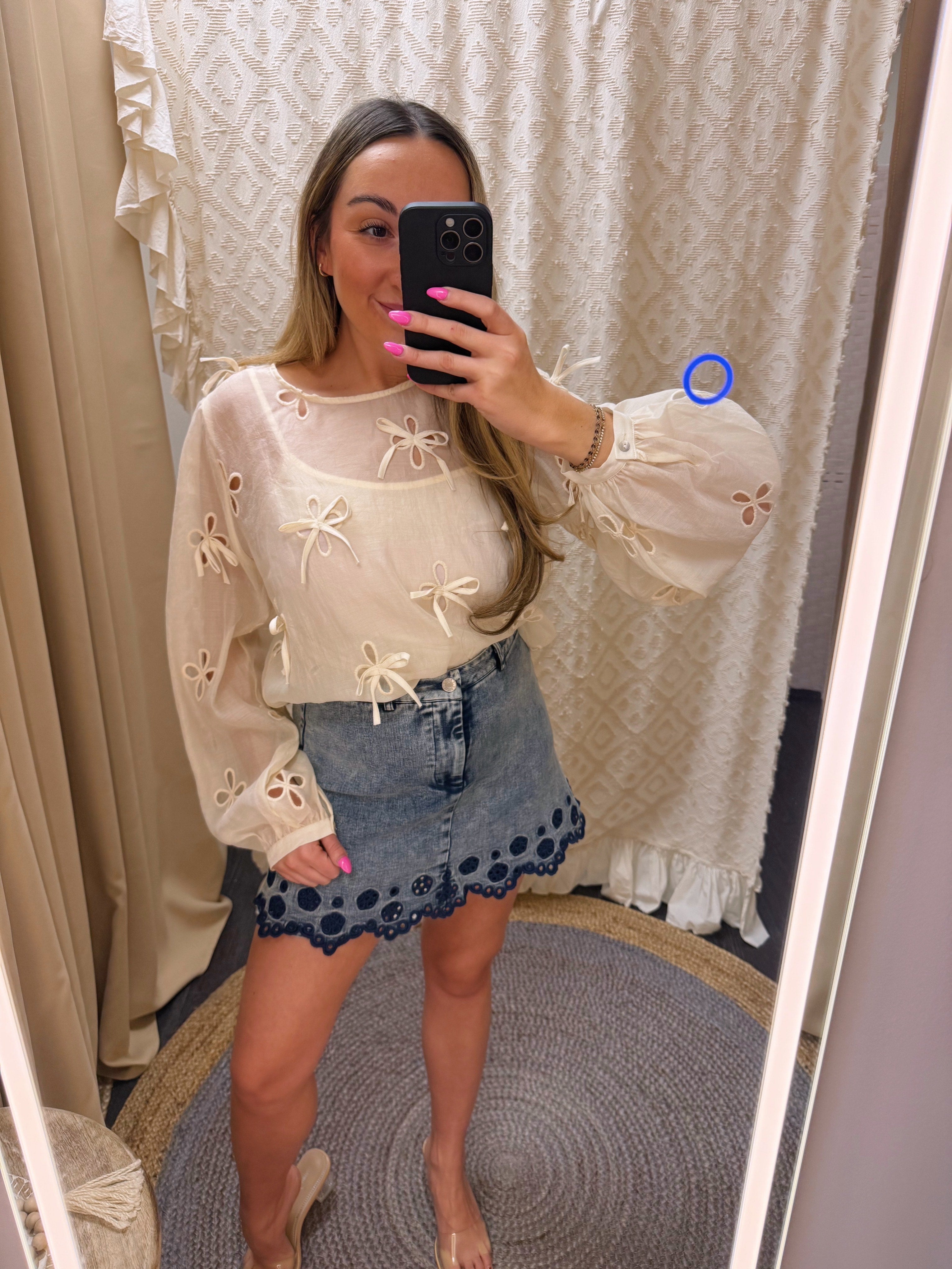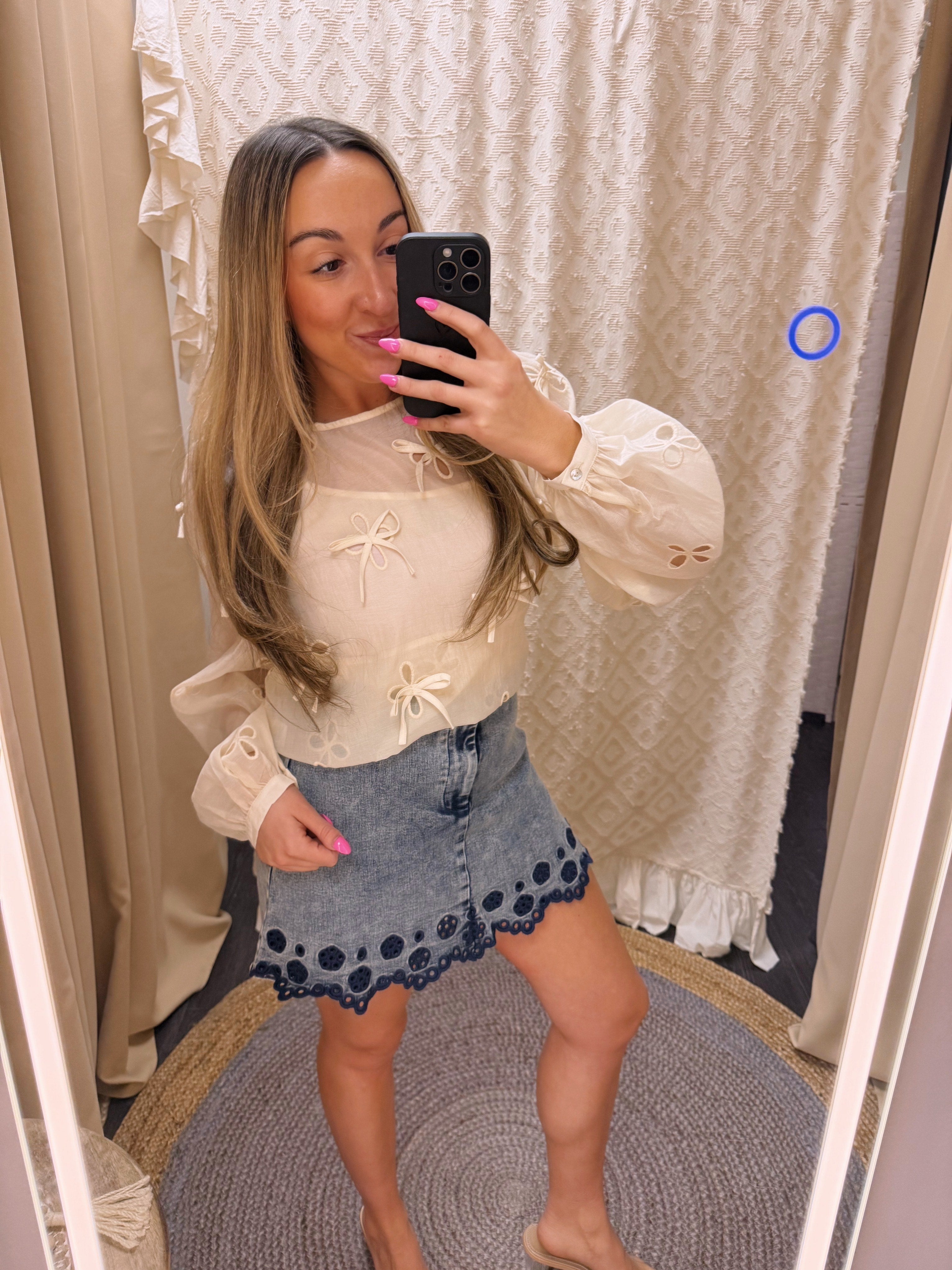 It feels like a skirt but moves like shorts — total win for freedom and style. The washed denim keeps it casual yet polished, making it easy to dress up or down depending on the day.Details: