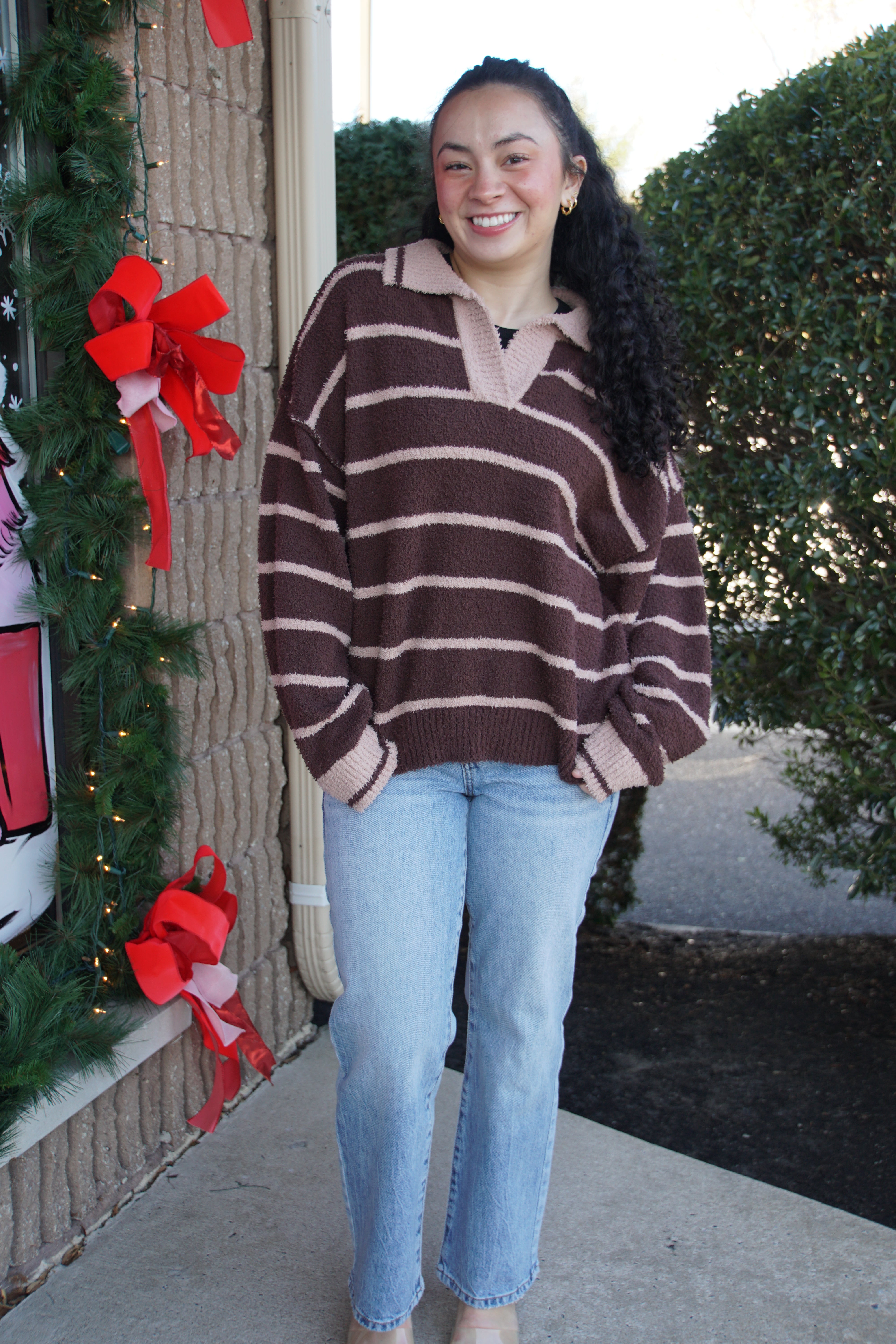 Layer up in style with the Brown Sugar Stripe Knit, a cozy long-sleeve sweater that blends classic polo collar charm with modern striped detailing. This knit piece strikes the perfect balance between preppy and relaxed— The soft, breathable fabric makes it ideal for transitional weather, while the timeless stripe pattern ensures it pairs effortlessly with everything in your closet. A wardrobe essential that's anything but boring.