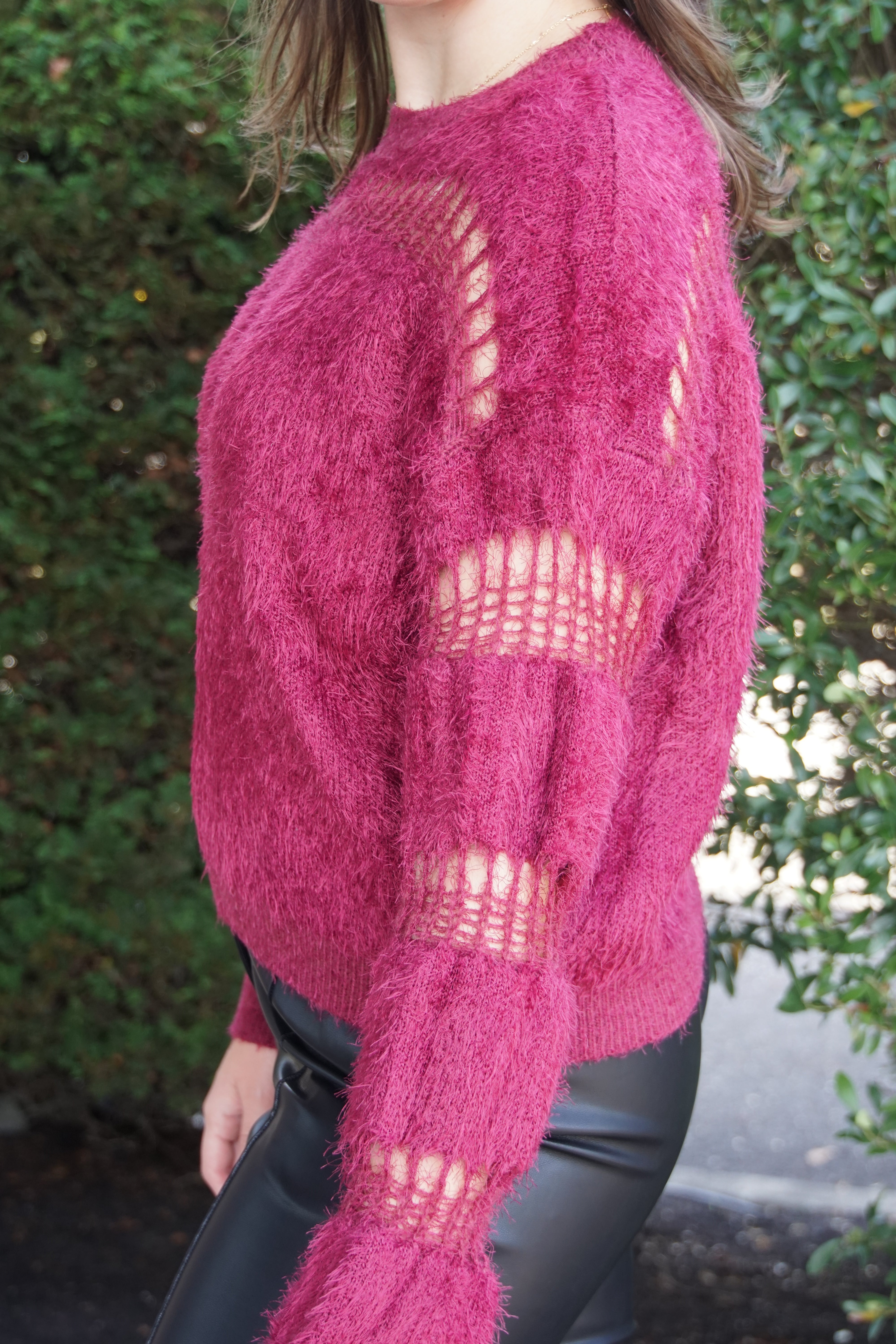 Stay cozy and chic in this Fuzzy Open Stitch Sweater, featuring linear open stitch detailing for a modern twist. Perfect for layering or wearing solo, this stylish piece adds warmth and texture to any look.