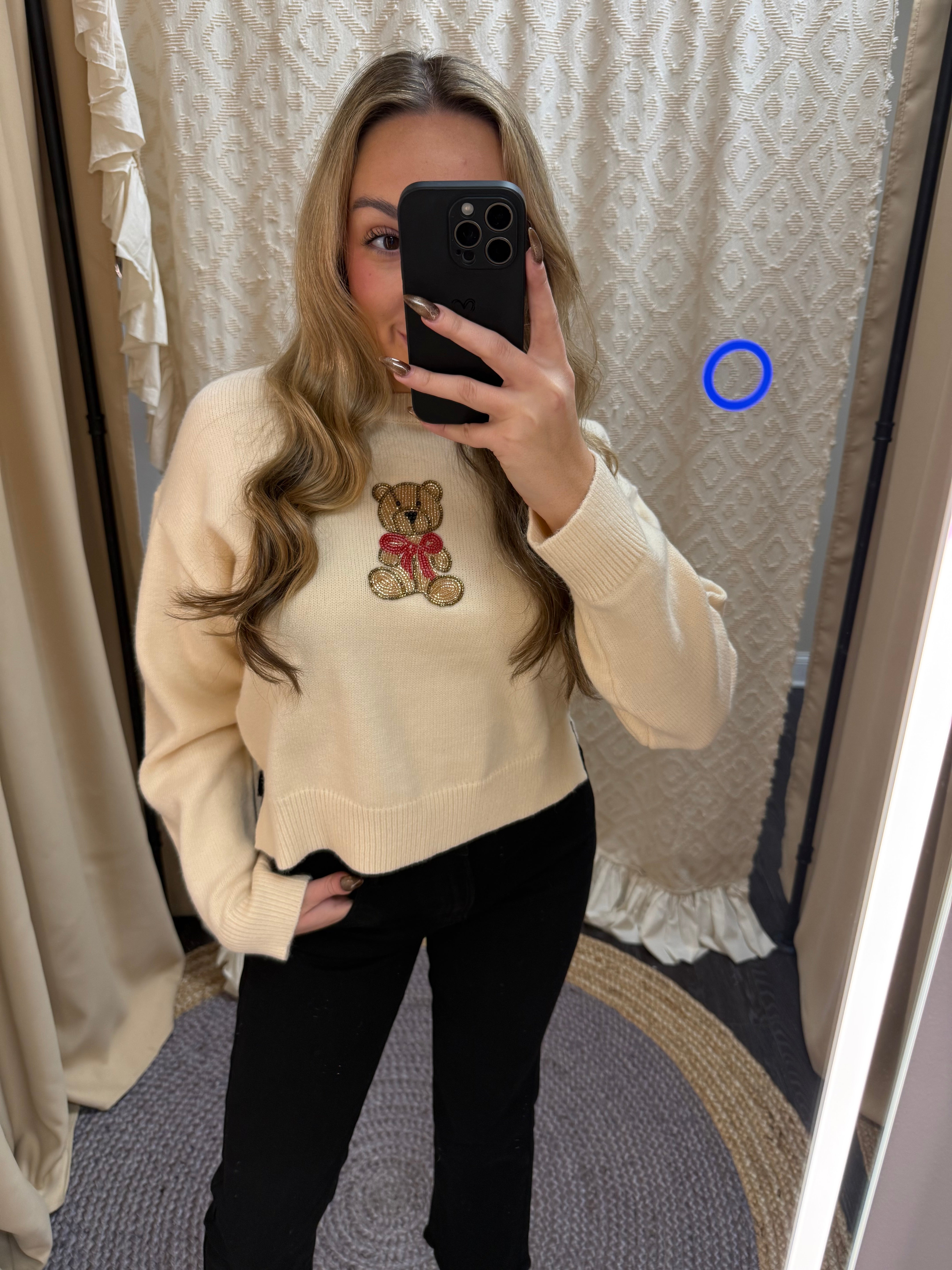 Wrap yourself in holiday magic with this adorable Sleigh Bell Teddy Sweater! Crafted in a warm sand tone, this cozy knit features delicate beaded embellishments that catch the light with every movement. Perfect for festive gatherings or lazy winter days, it's the sweater that makes you smile. Soft, snuggly, and just the right amount of sparkle—your new favorite is here!