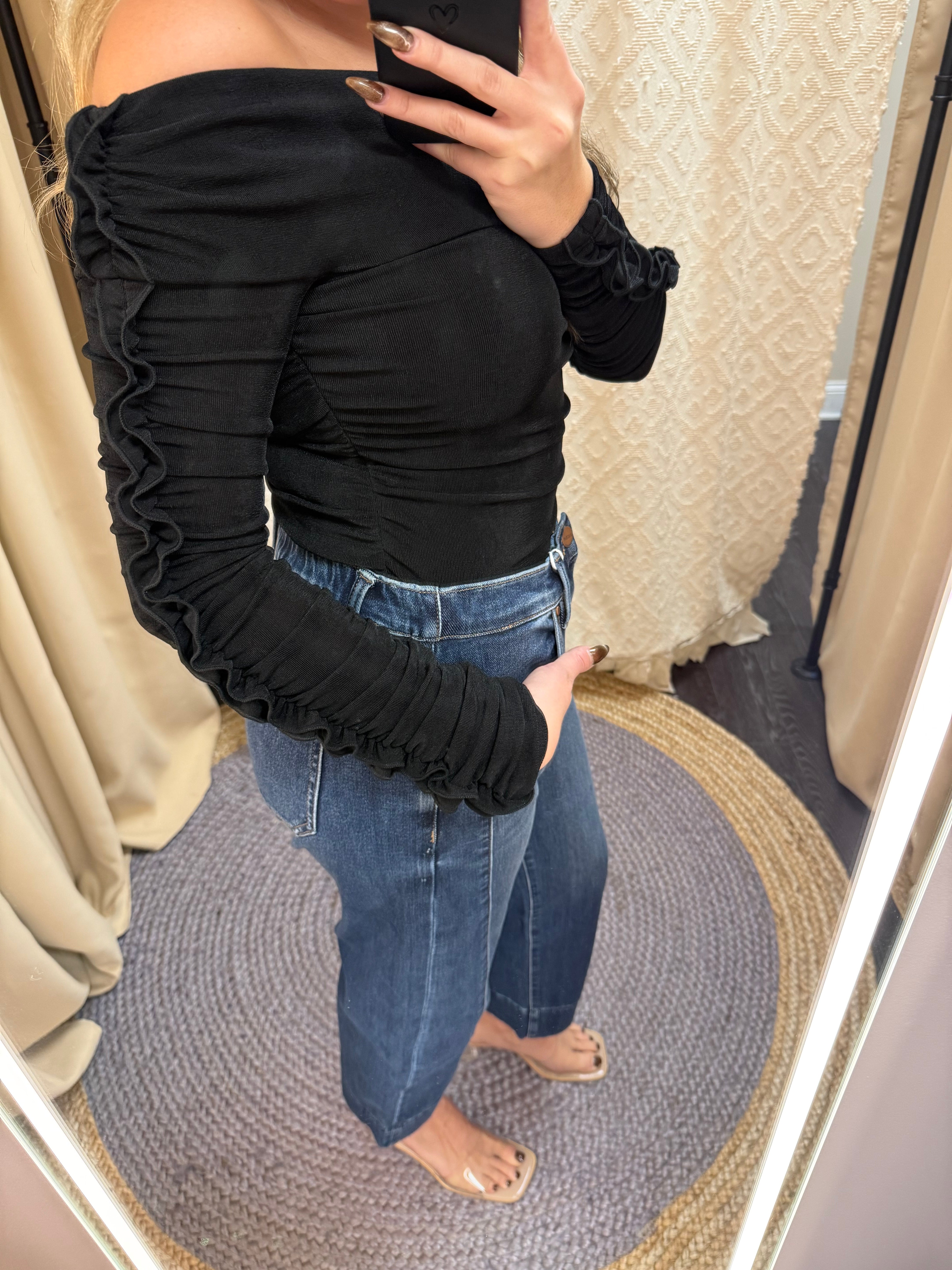 Slip into effortless elegance with this jet black ruffle knit top—the perfect excuse to turn heads on your night out. The off-shoulder silhouette strikes that sweet spot between sultry and sophisticated, while delicate ruffles add just enough texture to keep things interesting. Crafted from a luxurious knit that hugs in all the right places, this piece pairs seamlessly with your favorite jeans or a sleek skirt. Whether you're hitting the town or stealing the spotlight at dinner, this chic essential delivers major impact with minimal effort.