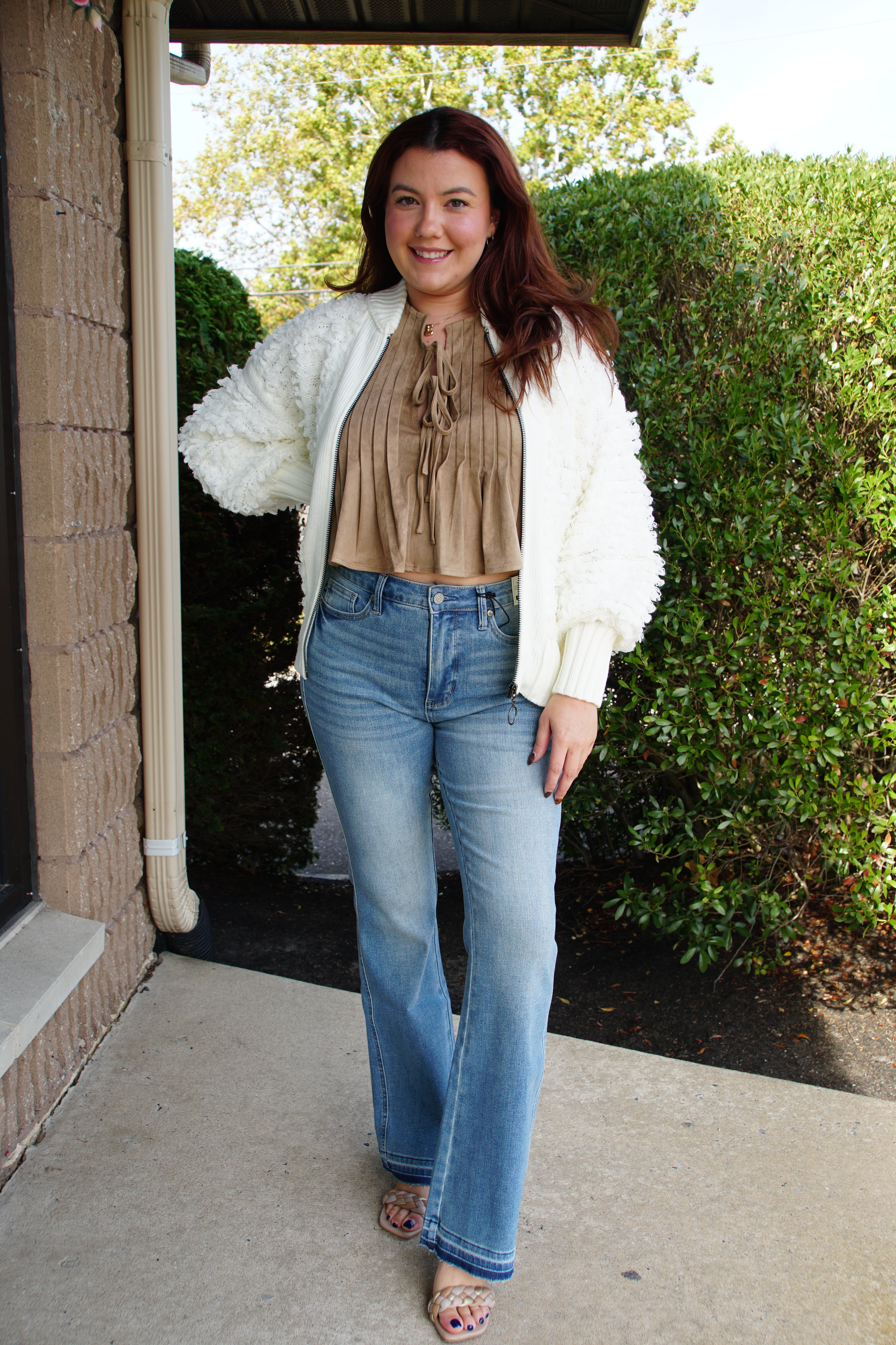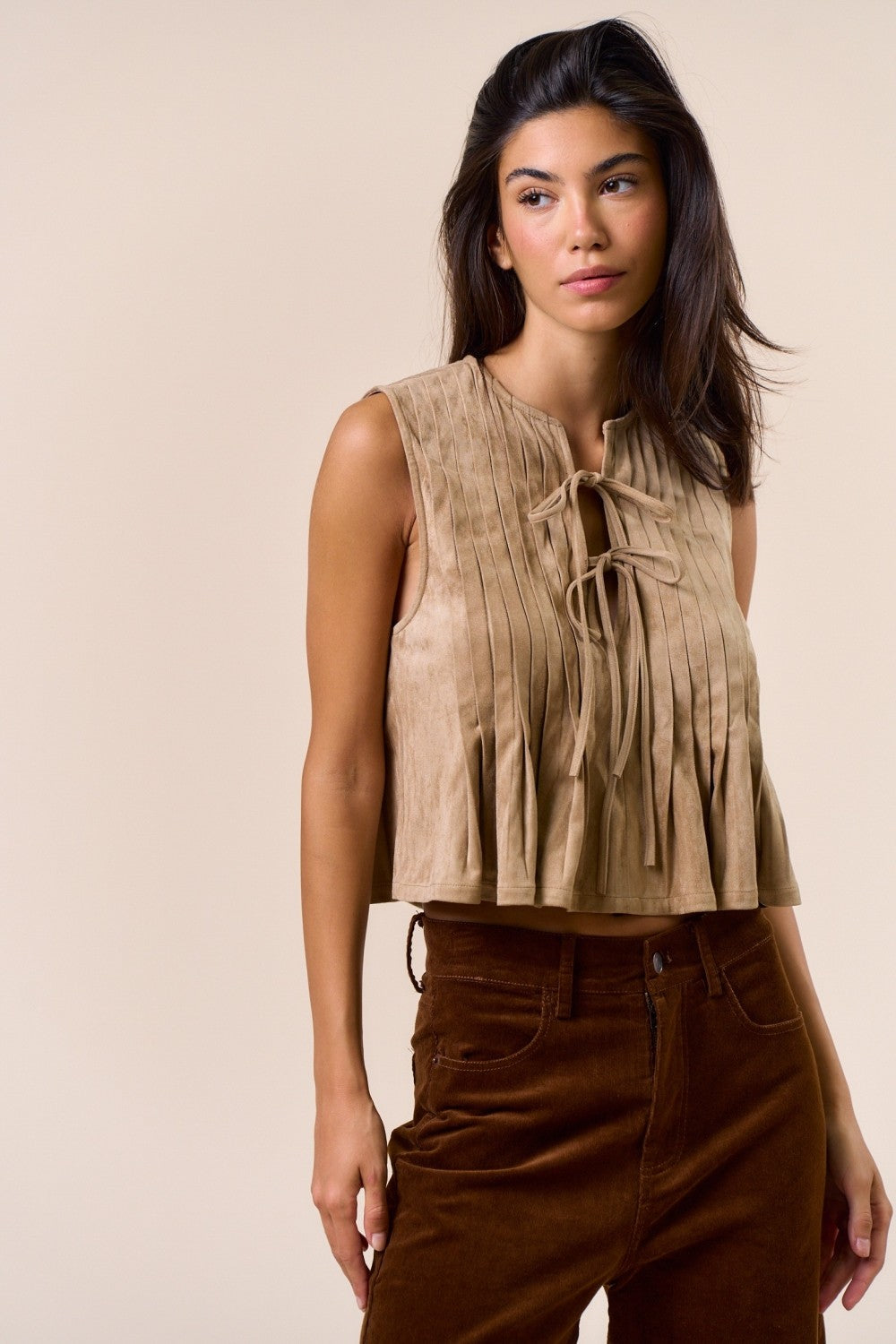 This sleeveless suede tie top brings flirty charm to your wardrobe with its soft texture and playful front tie detail. Perfect for layering or wearing solo, it adds a touch of suede sophistication while keeping things light and breezy for warm days. Easy to dress up or down, this top invites you to tie it your way and show off your style with a wink.